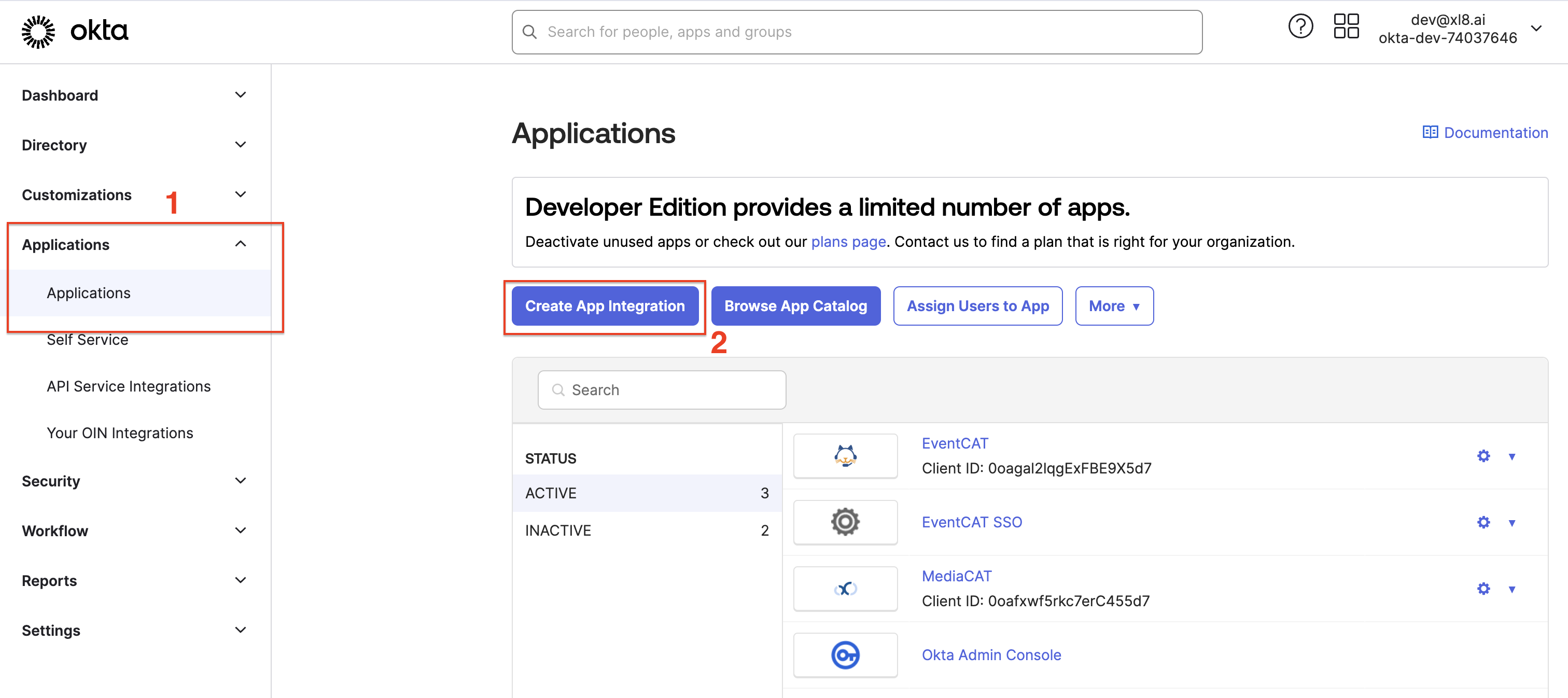 - Go to the Applications → Applications on the left side bar, and click Create App Integration button.