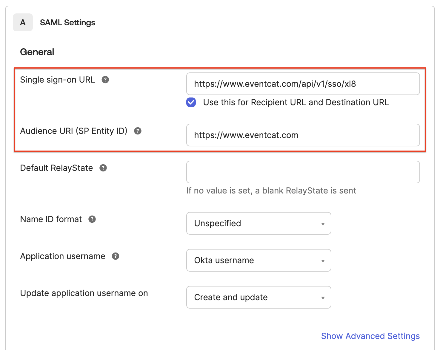 https://app.eventcat.com/api/v1/sso/YOUR_ENTITY_ID- For the Entity ID, we recommend that you include a name that makes it easy for team members to find your organization, preferably in plain text.
