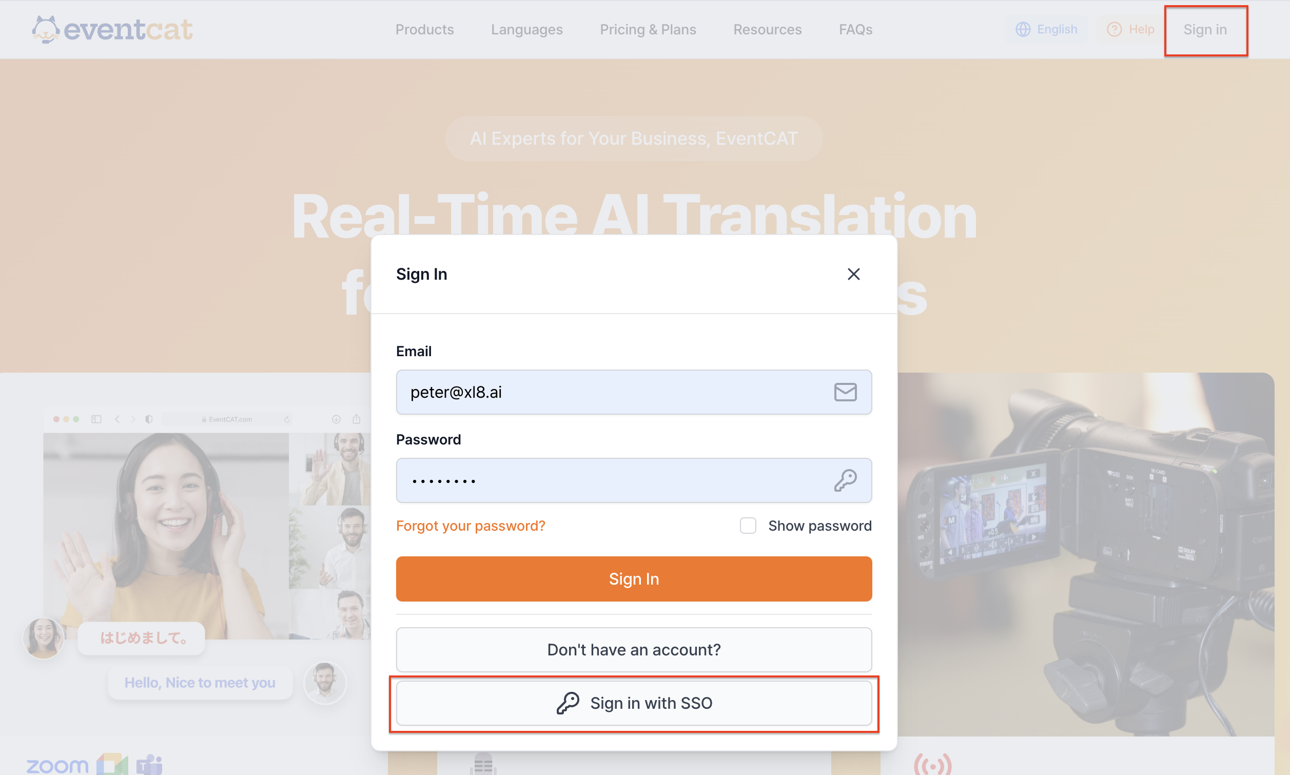 - Go to EventCAT SSO Login page or use the Sign in button on the top navigation bar on the EventCAT website.