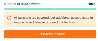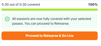 Completing checkout means assigning passes to your scheduled sessions. All sessions must be covered with valid passes (100% pass coverage) before you can rehearse or go live.