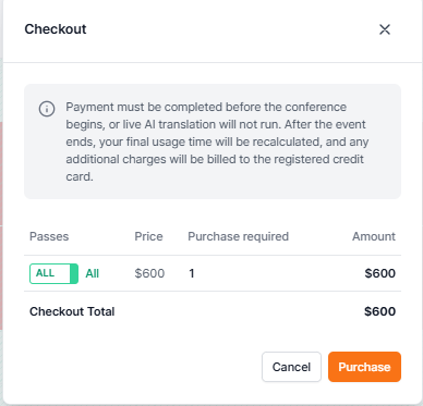 This guide walks you through the required steps to complete the Conference V2 Checkout and prepare your event for EventCAT’s real-time AI translation and captions.
