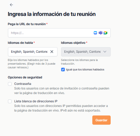 Después de revisar los detalles finales de la reunión, haz clic en Invitar intérprete IA y espera a que el bot intérprete entre en la sala de espera deMeet (puede tardar hasta 20 segundos).