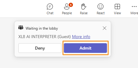 - Cuando aparezca una ventana emergente en Microsoft Teams, haz clic en Aprobar para admitir al bot intérprete AI en la reunión.