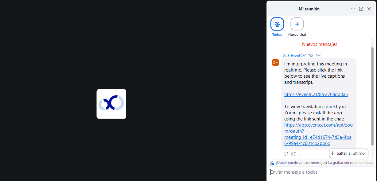 Nota importante: Si la reunión en línea tiene contraseña o según la plataforma utilizada, el anfitrión o un participante podría necesitar hacer clic en “Admitir” para permitir que el Intérprete AI de EventCAT se una. Solo después de ser admitido, el Intérprete AI podrá ofrecer subtítulos traducidos en tiempo real.
