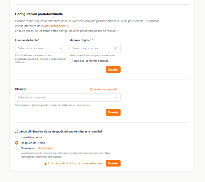 Una vez que el Intérprete IA de EventCAT se une a tu reunión, no podrás cambiar los idiomas. Asegúrate de que ambos estén correctamente configurados antes de invitarlo.