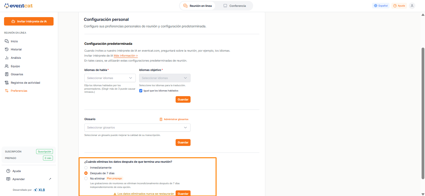Los datos de la reunión (subtítulos y minutos) generados por EventCAT OnlineMeeting se almacenan, por lo general, durante 7 días después de que finaliza la reunión. Los usuarios pueden configurar el período de retención de forma individual para cada reunión.