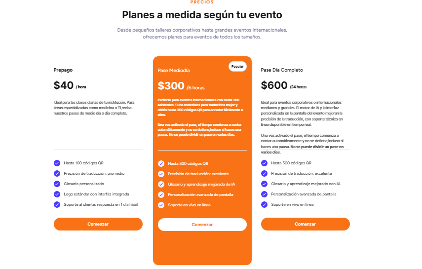 Este plan te permite prepagar tantas horas como necesites y usarlas en múltiples sesiones. Por ejemplo, si compras 5 horas, puedes dividirlas en varios eventos, como 30 minutos, 1 hora o 2 horas cada uno. Ideal para talleres cortos, conferencias o seminarios internos que se realizan con frecuencia. Soporta hasta 100 conexiones simultáneas a la página de subtítulos en tiempo real e incluye funciones como Glosario, Transcripción y Resumen de la Reunión.Pase de Medio Día: $300 / 6 horas