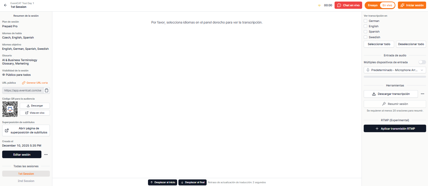 Después de completar las pruebas con la Prueba Gratuita y comprar un pase, configura las sesiones del evento que requieren traducción en la Sala de Conferencias.