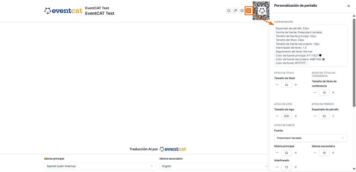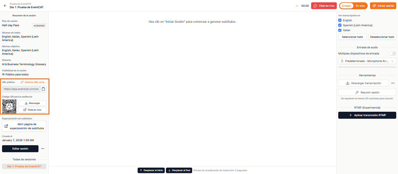 Configura los subtítulos en pantallas presenciales y descarga códigos QR para el acceso multilingüe