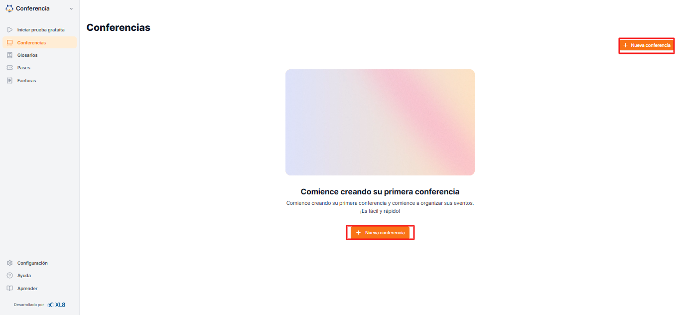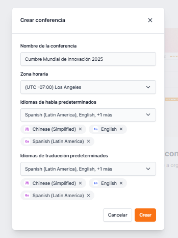Una conferencia es el espacio donde preparas y operas el evento real. Puedes manejar todos los preparativos necesarios antes de que comience el evento, como la creación de sesiones, la configuración de idiomas, la asignación de pases y la configuración de subtítulos en tiempo real. Después de navegar a la sala de conferencia, haz clic en Crear