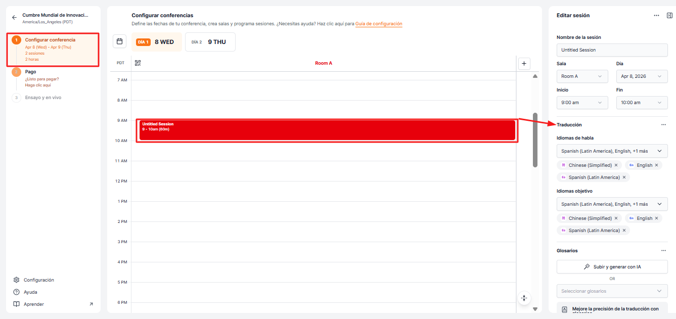Dentro de la conferencia creada, agrega sesiones de acuerdo con el horario del evento. Puedes configurar el idioma y el entorno de audio para cada sesión.