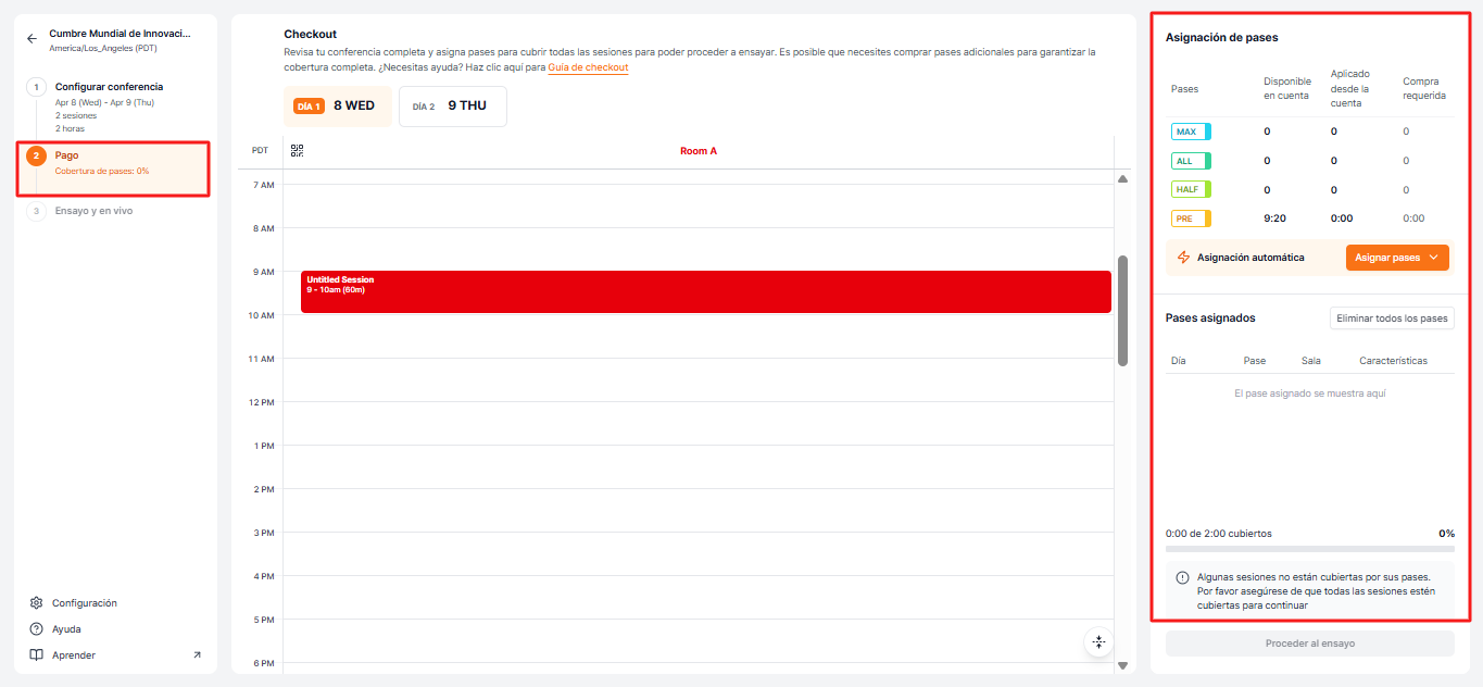 Una vez que las sesiones estén listas, asigna los pases a cada sala de conferencia.