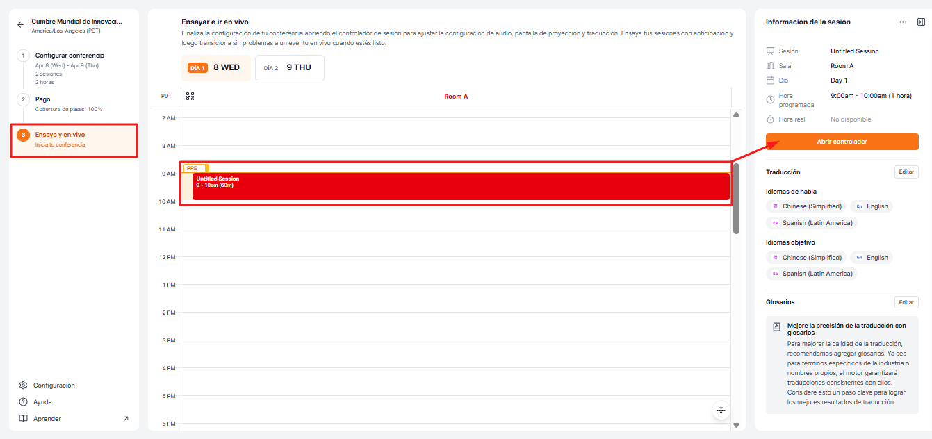 Una vez que todas las configuraciones de la conferencia, sub-sesiones, aplicaciones de pases, glosarios, audio e idiomas estén completas, ahora puedes comenzar el ensayo con el mismo entorno de configuración que el evento real.