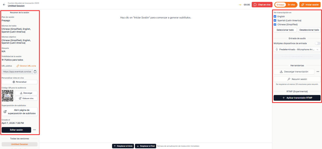 El panel de control es la página donde puedes gestionar la configuración clave y el progreso antes y durante el evento. Desde aquí, puedes verificar el estado de la aplicación del glosario, los idiomas de origen y subtítulos, el estado de entrada de audio y también ver rápidamente la URL y el código QR para compartir con los participantes.