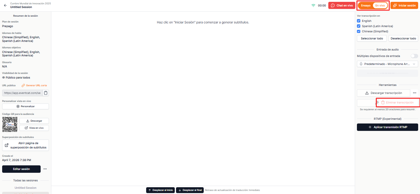 Iniciar la interpretación simultánea con IA en tiempo real en tu evento