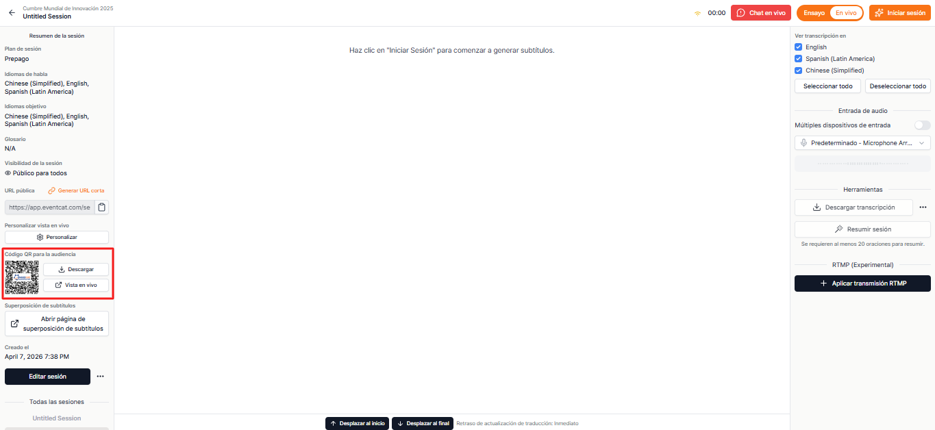 Información de acceso de los participantes: Comparte la URL y el código QR para que los participantes vean los subtítulos en sus dispositivos personales.