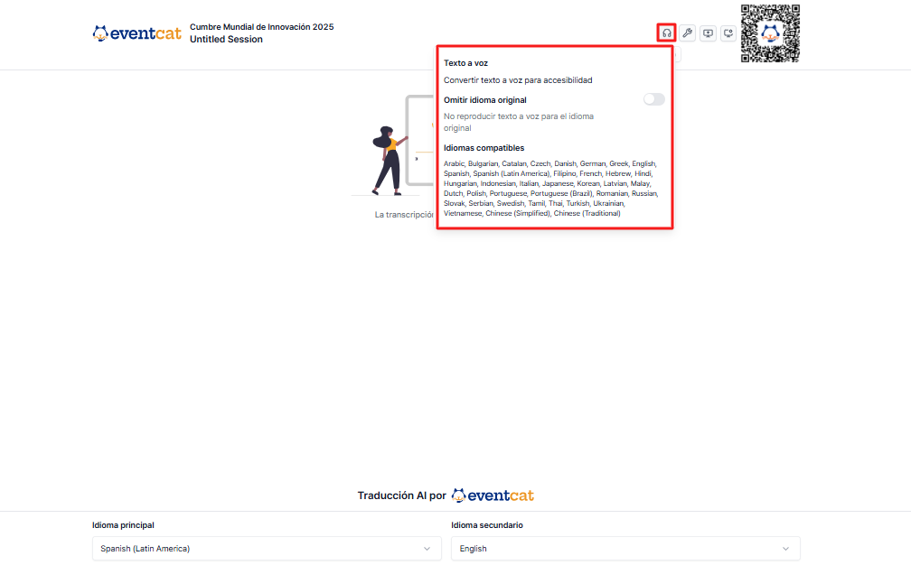 EventCAT también admite la funcionalidad de Texto a voz (TTS) además de los subtítulos. Después de acceder mediante el código QR, los participantes pueden conectar auriculares o un casco a su dispositivo personal para escuchar el contenido traducido en su idioma preferido.