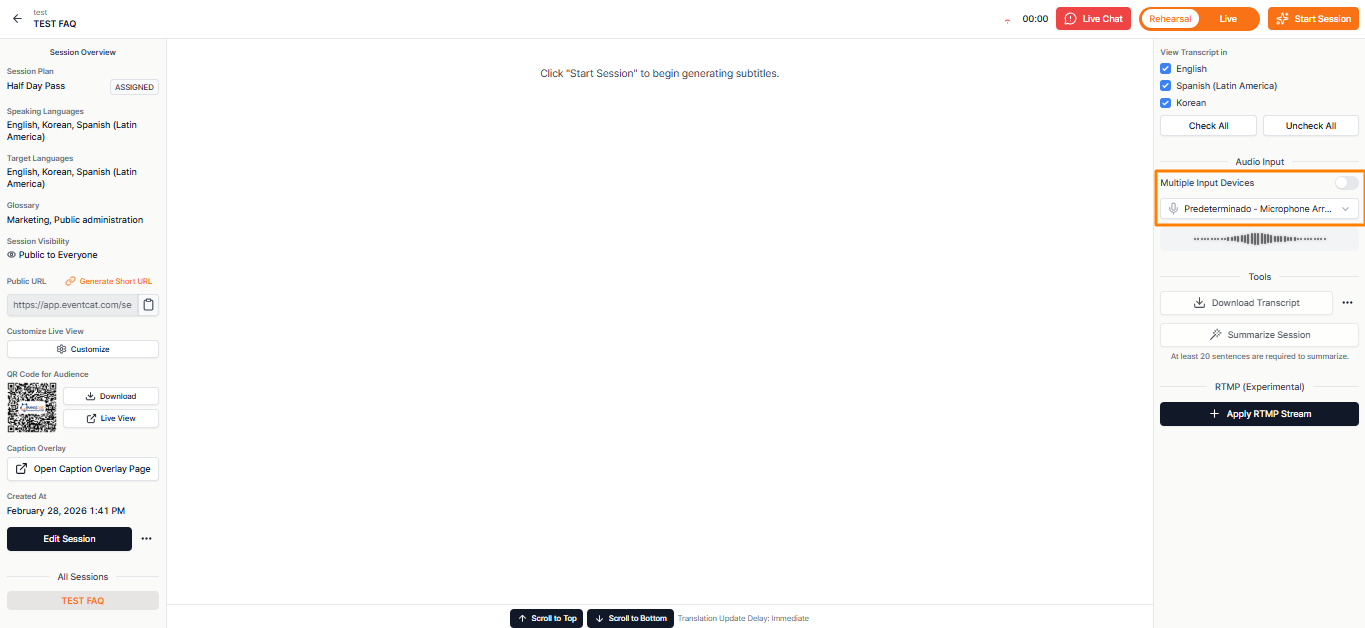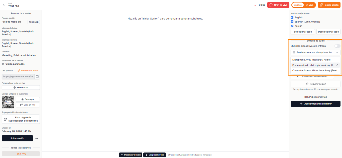 - Si EventCAT no detecta el audio, no se proporcionarán subtítulos de traducción en tiempo real.