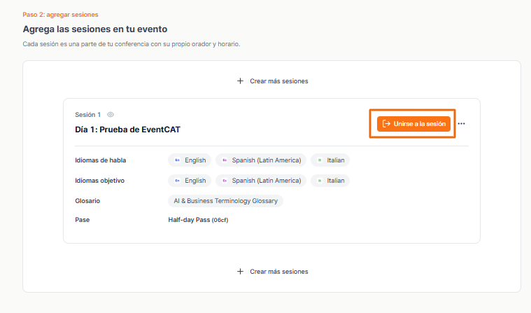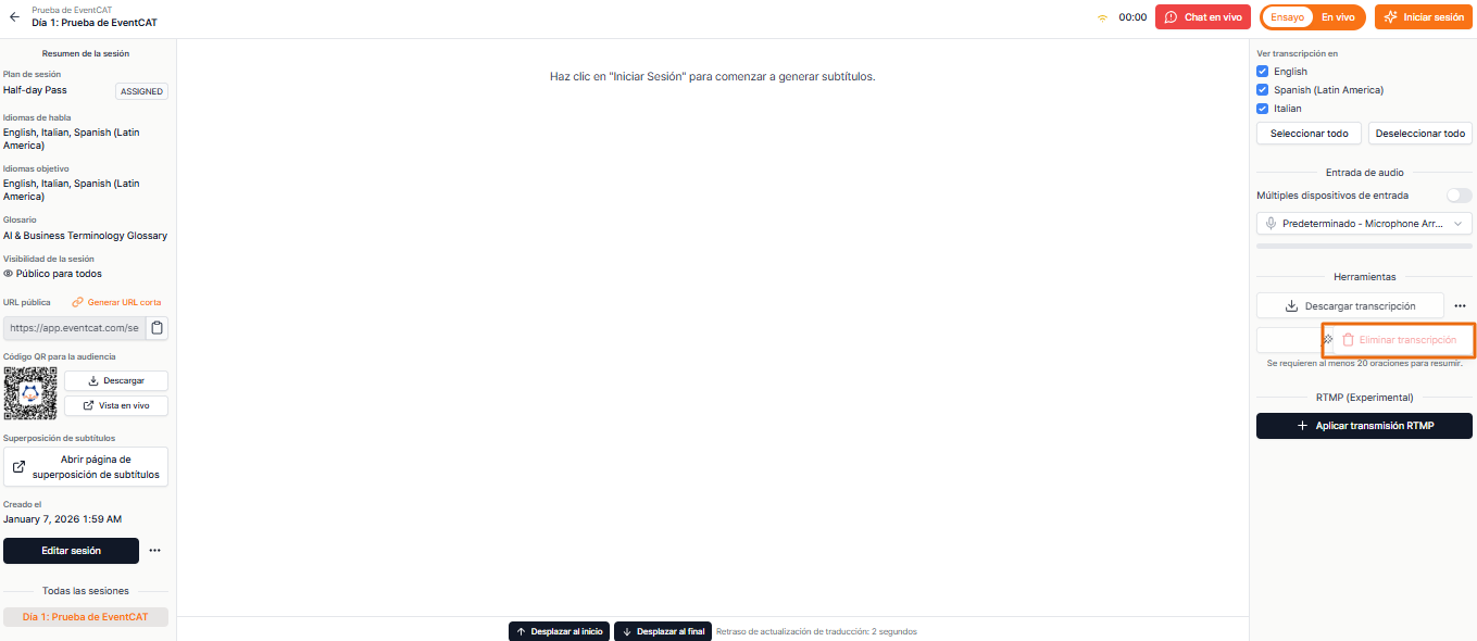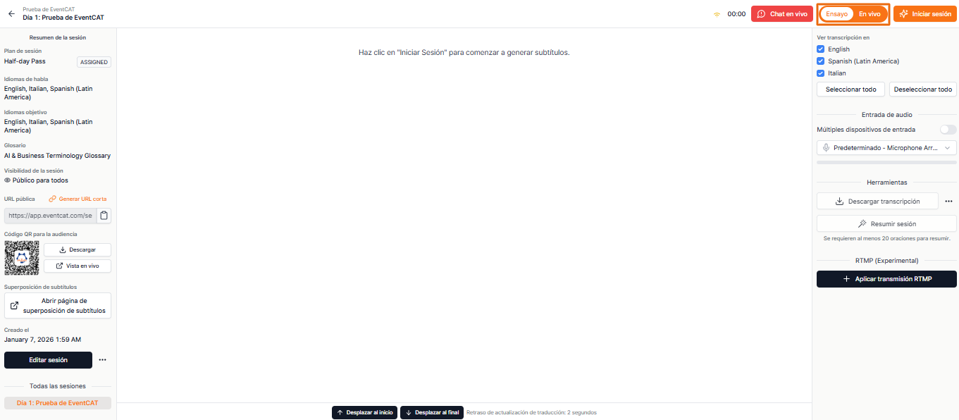 Si quieres asegurarte de que todo funcione correctamente antes de tu sesión en vivo, el Modo Ensayo te permite probar los dispositivos de audio, la configuración de idiomas y el diseño de la pantalla en un entorno privado. Nada será visible para los asistentes hasta que cambies a Modo En Vivo.