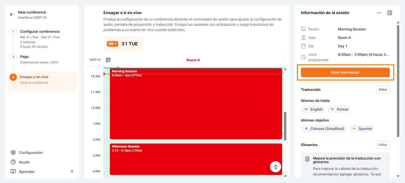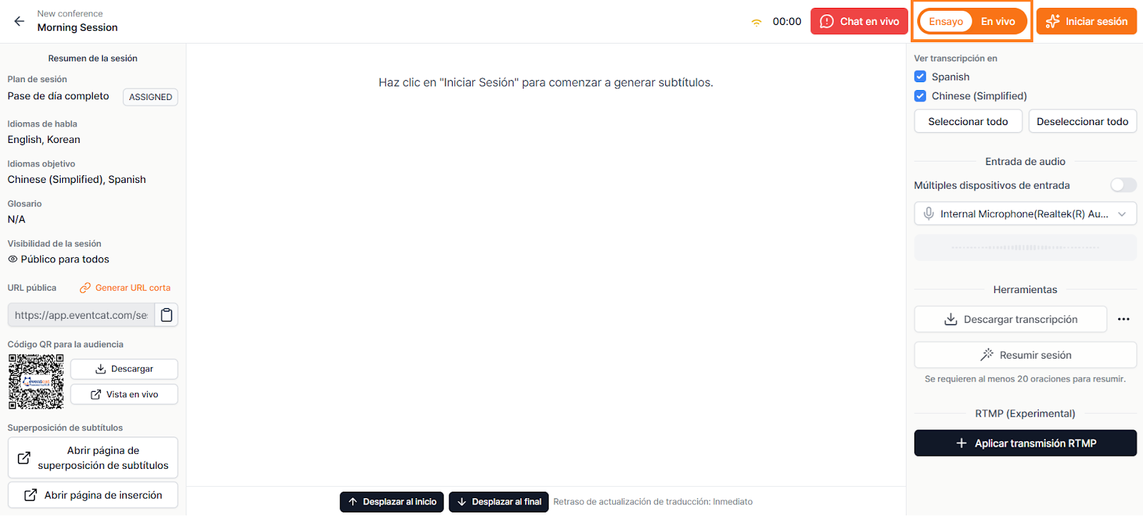 ¿Quieres asegurarte de que todo funcione antes de tu sesión en vivo? Con el Modo de Ensayo puedes probar micrófonos, dispositivos de audio, configuraciones de idioma y diseño de pantalla en un espacio privado. Nada será visible para los asistentes hasta que cambies a Modo En Vivo.