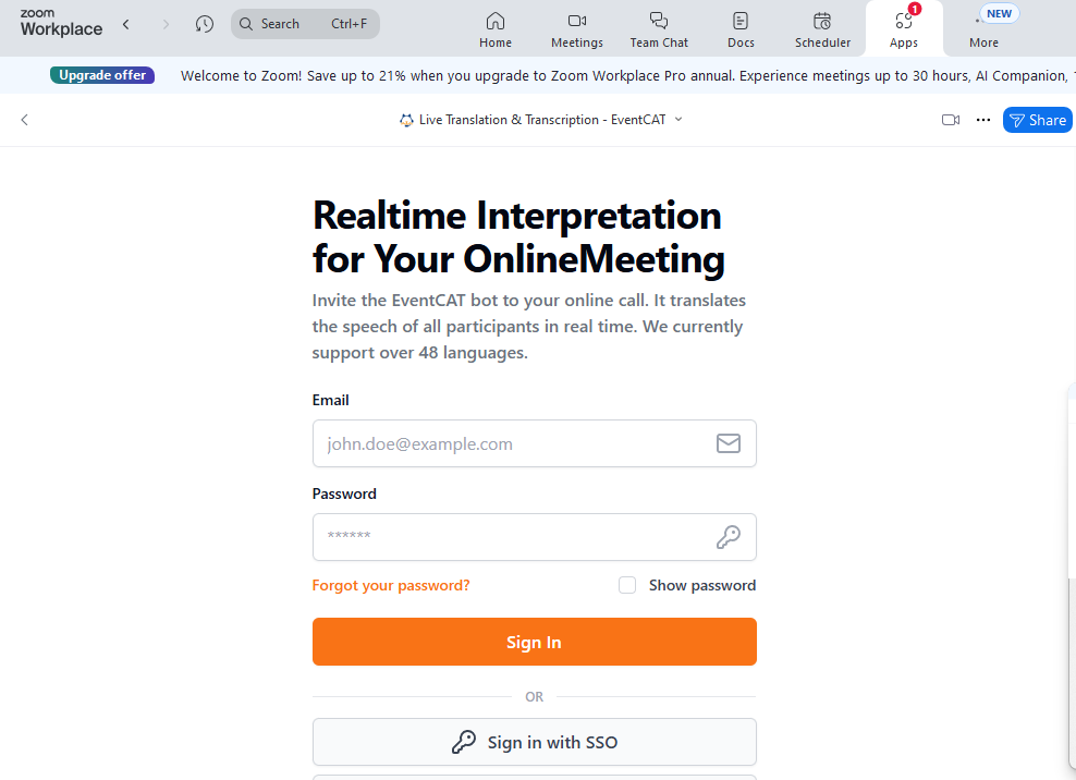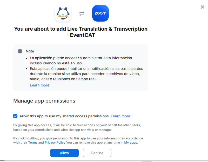 EventCAT ahora está totalmente integrado en Zoom: sin cambiar de ventana, sin navegador y sin fricciones. Traducciones en tiempo real directamente dentro de tus reuniones.