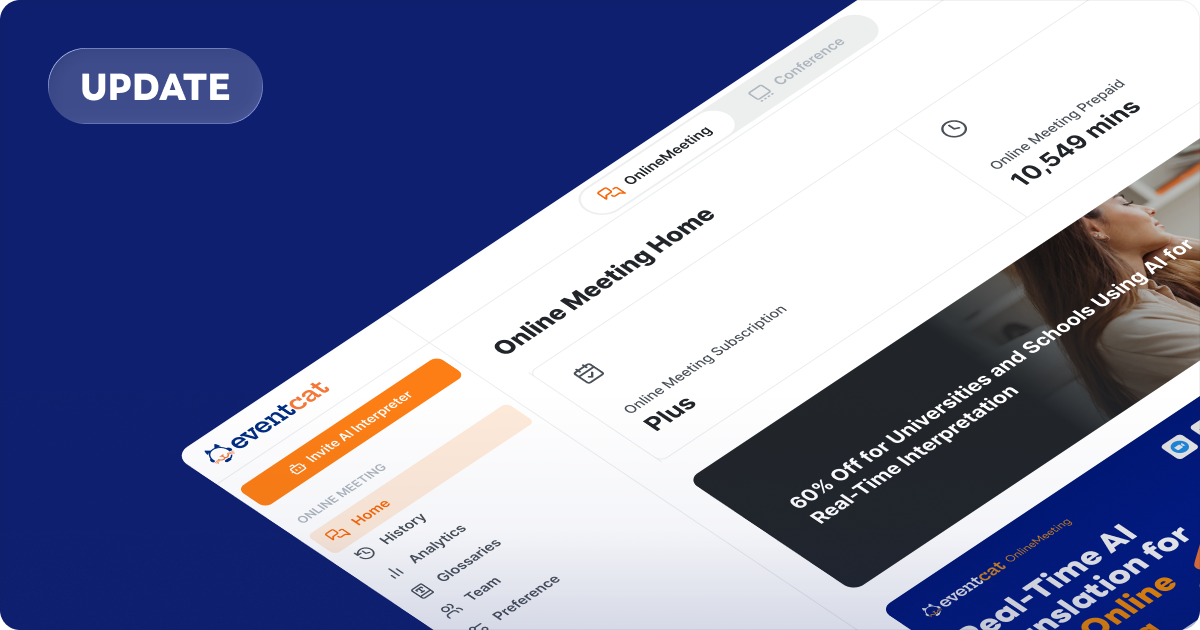 Este mes, EventCAT transforma la forma en que gestionas reuniones en múltiples idiomas. Las traducciones en tiempo real ahora aparecen directamente en Zoom, lo que permite a los participantes seguir la conversación de forma natural sin cambiar de ventana. Al mismo tiempo, el panel ha sido rediseñado para ofrecer a los organizadores visibilidad inmediata de sesiones, traducciones y glosarios, haciendo que la gestión de eventos complejos o de varios días sea más rápida e intuitiva.