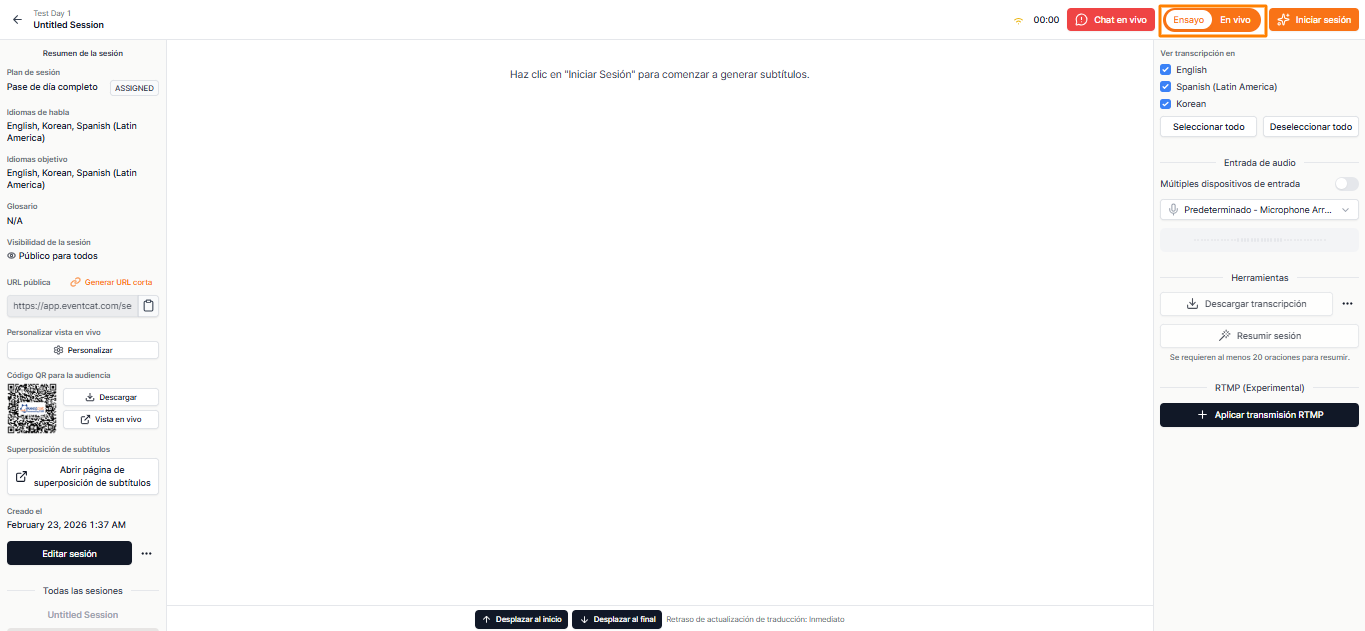 En el lado izquierdo, utiliza Vista en vivo para monitorear y editar tu sesión. En el lado derecho, verifica la configuración de entrada de audio.