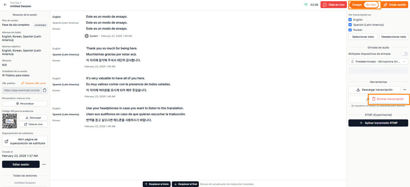 Todas las sesiones deben tener cobertura del 100% antes de poder ensayar y transmitir en vivo.