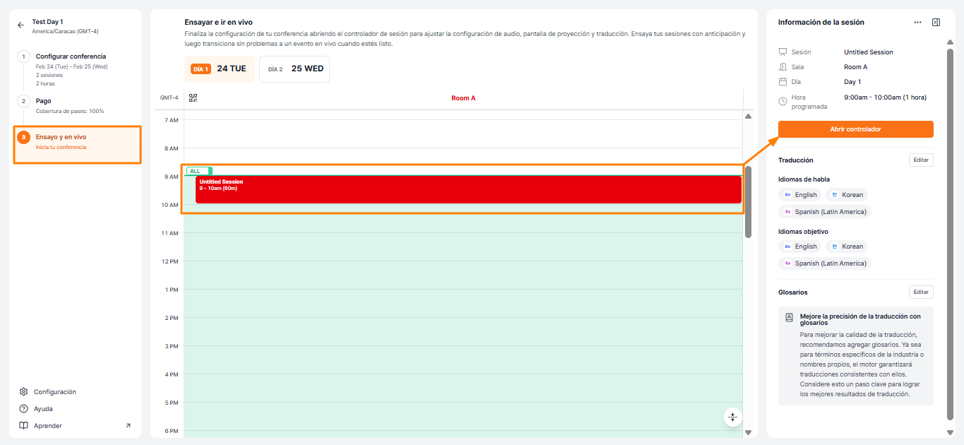 Una vez que tengas 100% de cobertura, haz clic en Ensayar y en vivo en el menú lateral izquierdo, selecciona tu sesión y luego haz clic en Abrir controlador para comenzar a gestionar y ejecutar tu evento.