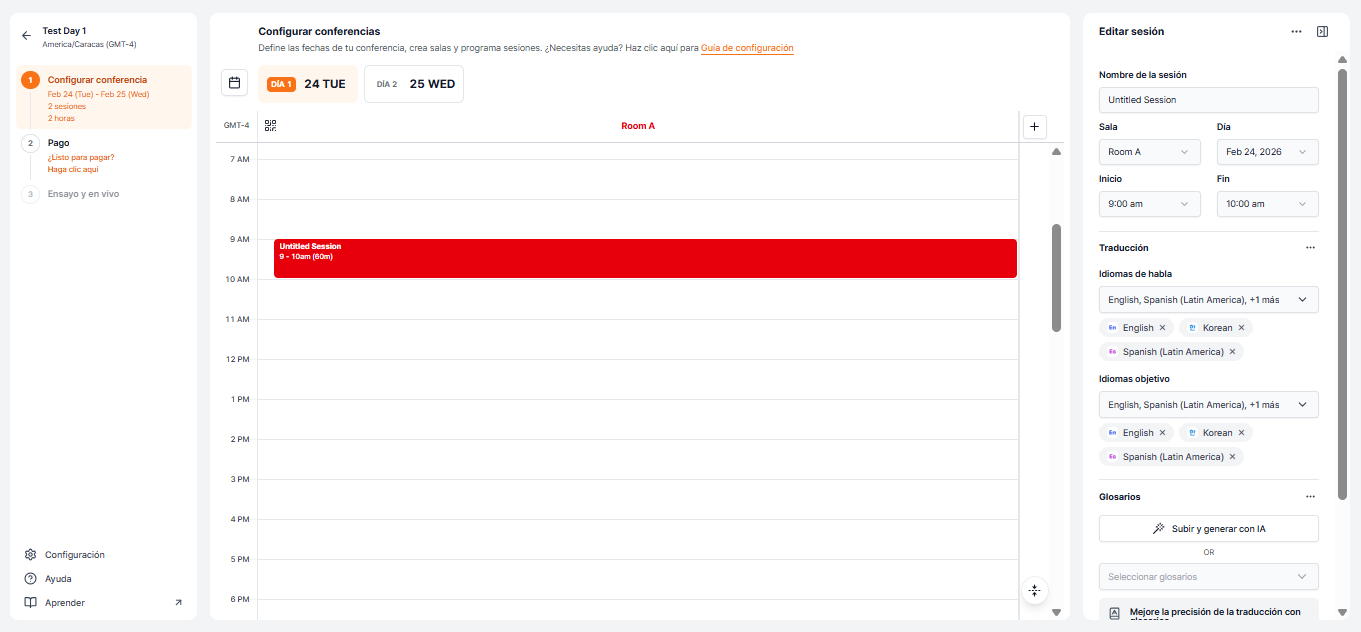 Ya sea que estés organizando un pequeño seminario o un gran evento internacional, habilitar interpretación multilingüe en tiempo real con EventCAT es rápido y sencillo. Esta guía paso a paso para Conference V2 te ayudará a configurarlo todo sin necesidad de experiencia técnica. En solo unos minutos, estarás listo para crear una experiencia fluida e inclusiva para participantes en cualquier idioma.