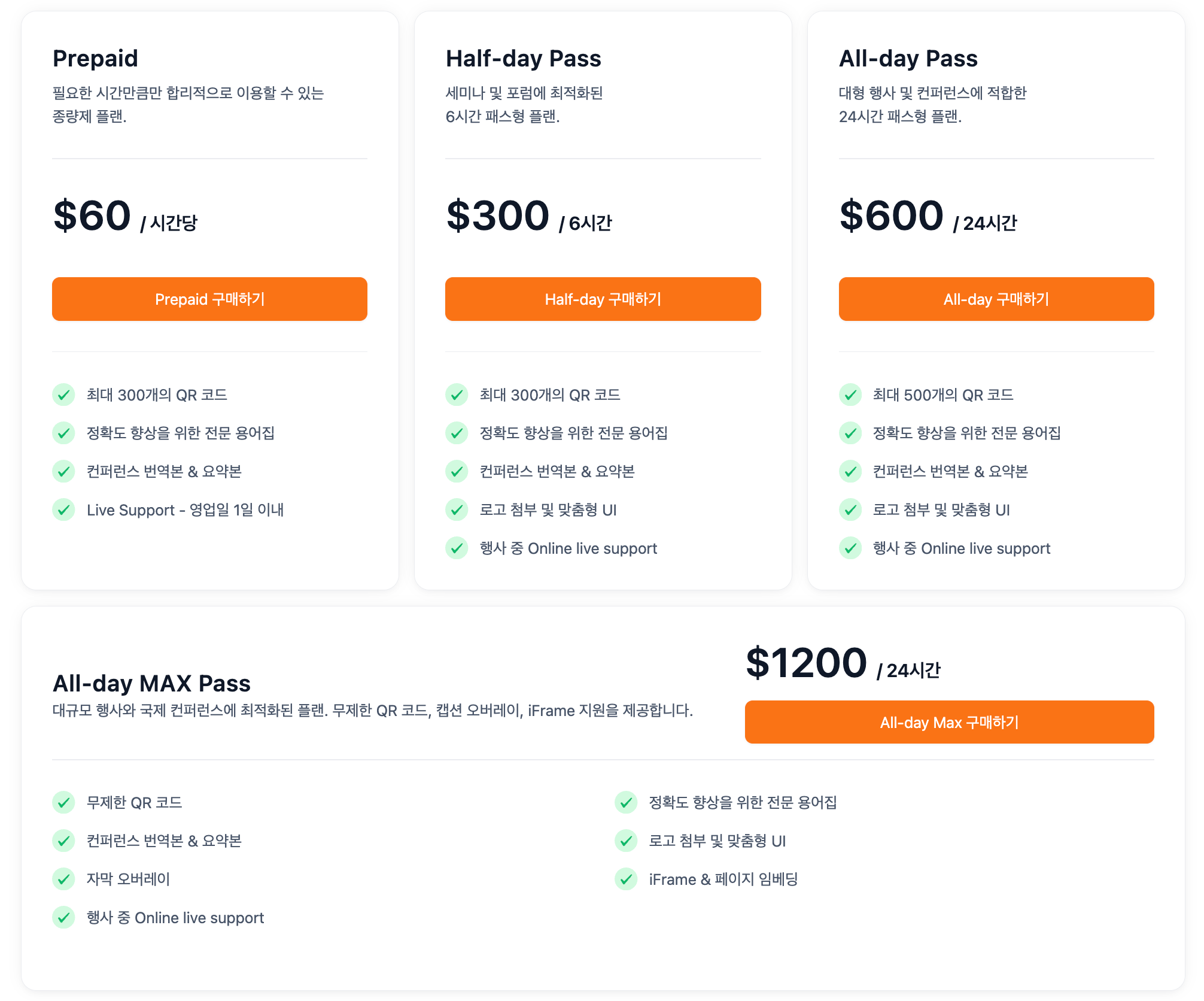 대규모 행사 및 특수 기능이 필요한 이벤트에 적합합니다. 특히, 유튜브 등 온라인 송출을 원하거나, 특정 플랫폼에서 여러 언어를 선택할 수 있도록 번역 페이지 임베딩이 필요한 경우 24시간 동안 해당 기능을 제공하는 해당 요금제를 선택해 사용할 수 있습니다.