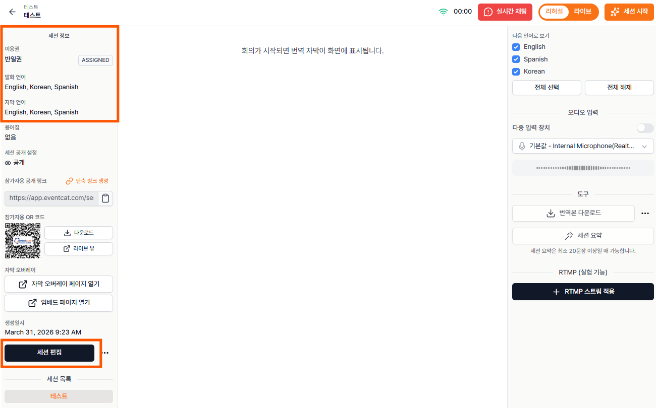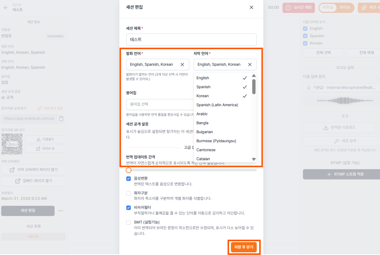 세션 도중에도 실시간 번역 자막을 일시 정지 후 언어 설정을 수정할 수 있습니다. 다만 세션 중 언어 설정을 변경할 경우 반드시 세션을 먼저 중지한 뒤, 설정을 변경할 수 있습니다.