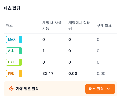 현재 계정 보유량을 초과해 추가로 필요한 패스는 ‘구매 필요’로 표시됩니다.