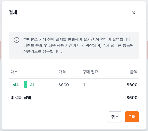 이 가이드는 새로운 EventCAT Conference UI에서 체크아웃을 완료하고, EventCAT의 실시간 AI 번역 기능을 사용할 수 있도록 행사 설정을 마무리하는 과정을 안내합니다.